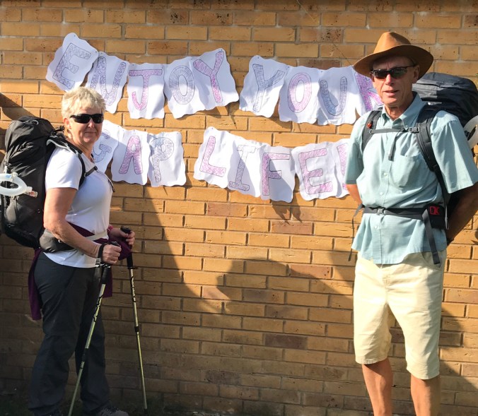 Thanks to: (1) Anne for the walking poles – helped me avoid a more serious accident today. (2) Alli for the emergency ration chocolate. (3) Caroline for introducing me to toe protectors. (4) Lynda for the clothes recommendations – they’ve proved to be perfect. (5) Sarah Jane Bird for the glucose sweets that Steve found in his shorts pocket! (6) Geraldine for the little heart that keeps me inspired. (7) All our family and friends for your support and encouragement). ❤️
