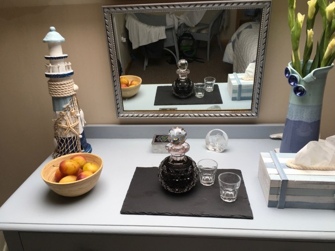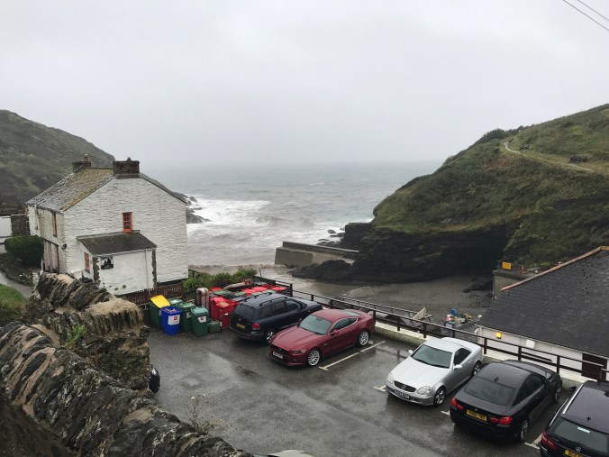 And so on to Mevagissey. We used to come here with the children when they were young so have happy memories of sunny days round by the harbour and its twisty lanes. Today sadly it looked bleak and the harbour water an unpleasant brown colour – lots of people milling round trying to fill their Sunday afternoon. We were lucky enough to walk up yet another steep hill and find our lovely airbnb – Rosie and Robin welcomed us with tea and cake and friendly chat – then showed us our cosy room – we even have a decanter of port and plums – what else could you possibly want? ๐
