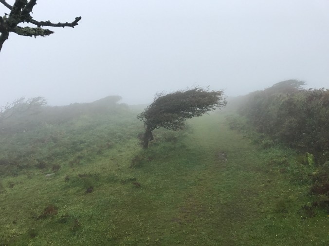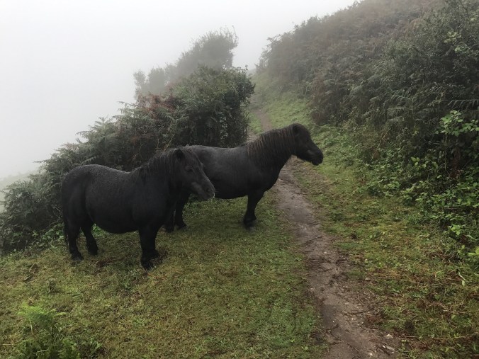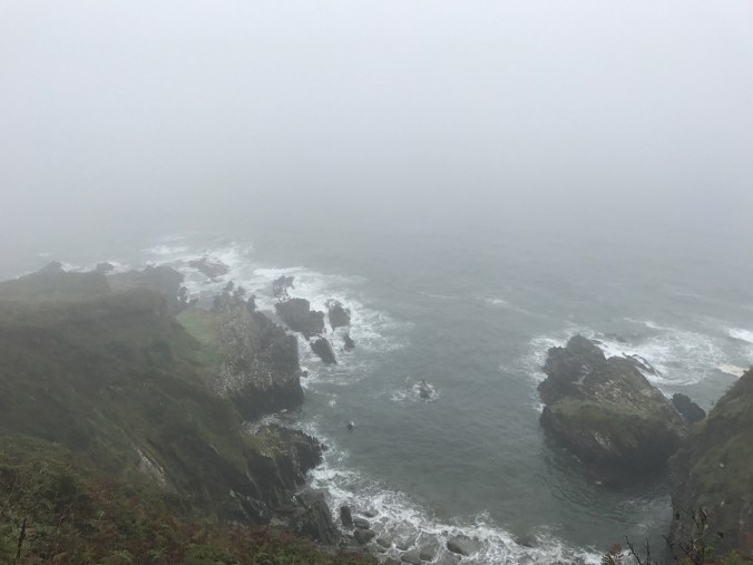 So much climbing involved today, hill after hill after hill, sometimes we thought it just couldn’t get any higher. A lot of countryside walking today, across fields, through woodland, narrow paths of soaking wet foliage. Even when the sea was in sight it wasn’t (we couldn’t see the sea!) – the fog was so thick we could literally see a few feet to our right and could just hear the high waves crashing on to the rocks. And boy did it rain, it didn’t stop all day – we were soaked down to our socks and undies!!