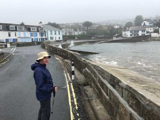 Carol was our airbnb host last night in beautiful Portloe, such a wonderful house and we loved Carol, didn’t want to leave. When Steve set off this morning to cover the first (ridiculously steep) mile and a half on his own, Carol and I enjoyed lots of chats before driving to Portholland to meet Steve. Steve of course had managed it in record time – looked a bit flushed though so sure there had been some running involved. I was a little anxious about this walk as it was to be ‘strenuous’ so when Carol offered to drive me on to Mevagissey, boy was I tempted. But I took up the challenge … and survived. The weather had changed today to full on winter – rain (torrential at times), wind and thick fog. Steve and I definitely came to the conclusion today that we are BONKERS!!