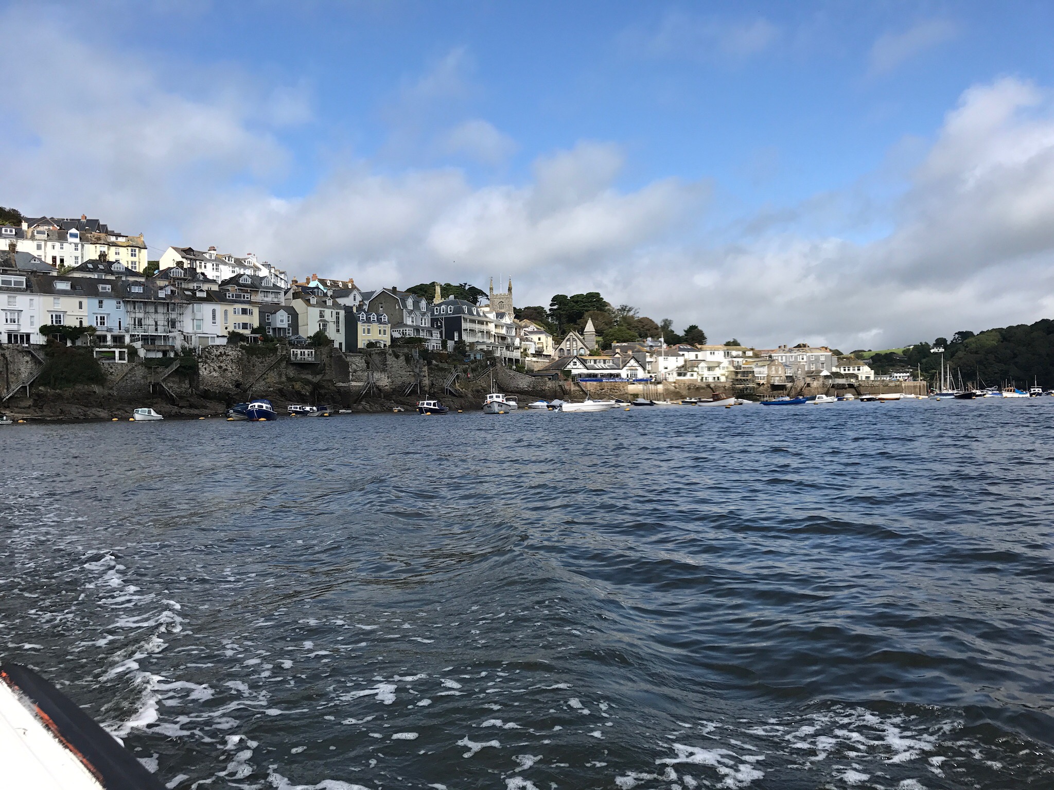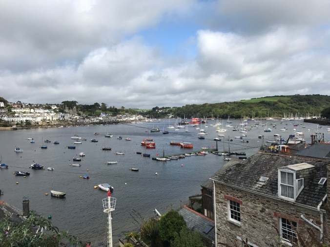 Arrived in Fowey at lunchtime and treated ourselves to a little look around town. As you walk in it’s so pretty with palm trees, pink and blue hydrangeas, wind in the willows garden, pastel coloured cottages – love this place. We were soaked and muddy up to our knees but found a lovely restaurant where they insisted we come in, despite our look!! I enjoyed a chunk of pork pie, rocket salad and homemade piccalilli (thought of you Gina!). After lunch we took the ferry to Polruan and started on the second part of today’s 15 mile walk.