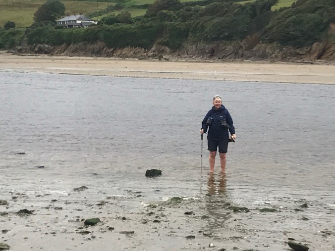 We met some other walkers in our B&B last night, Annette and Graham – they were doing this walk today too. We had done the ferry crossing together and had agreed to meet up at River Erme because we had to undertake a difficult operation there. We had to wait till within an hour of low tide and wade across the river at a certain point. By this time the wind was SO strong and the rain coming down fairly heavy too. The four of us did it together – safety in numbers.