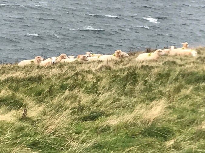 Passed some particularly stubborn cows at one point, they were hogging the whole path just by the gate. Despite Steve’s verbal requests and even some gentle nudging they wouldn’t budge an inch. We had to step off the path on the cliff slope to get round them. What is the world coming to!? Saw this flock of sheep laying right on the edge of the cliff – at least they weren’t in our way.