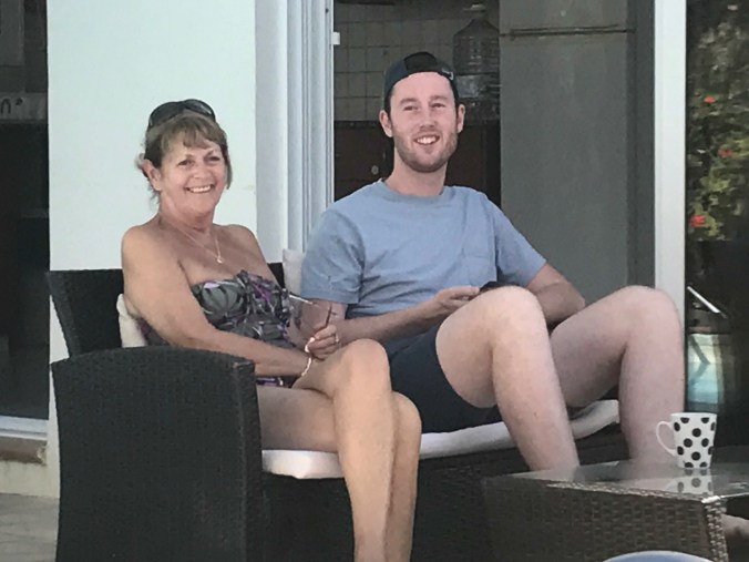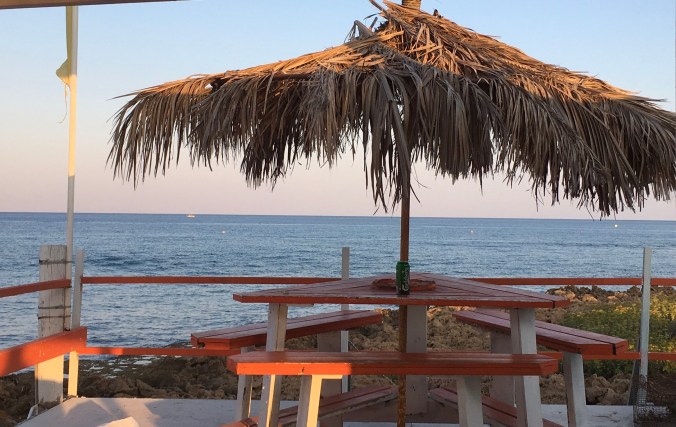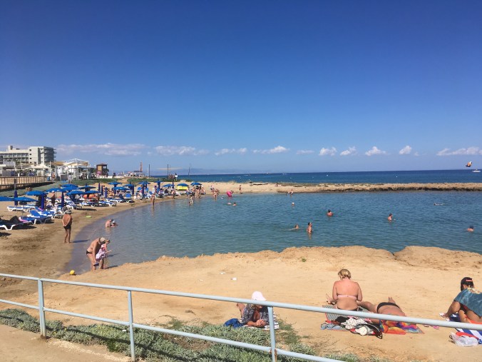 So have spent the first couple of days in a mixture of pool lounging and exploring the local area – beginning to find our feet.  Walked to Lidl’s yesterday to do the ‘big’ shop – on the way discovered Nick’s Bottle Shop, a discount booze store – every Brit abroad’s dream!!  Successfully shopped in there and Lidl’s and called for a taxi to take us home – no less than a limousine – excuse me!! Also wandered down to the local beach yesterday evening and this morning – so pretty and sea clear blue and extremely inviting (as soon as I finish this blog will be heading down there for a swim).  Steve and I have talked a lot about running – what time of day we’ll do it and what routes we’ll take …. but haven’t actually run yet!!  50 laps of the pool each morning for me so far and a few walks (nothing coastal)!!