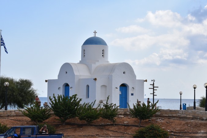 Took a late afternoon trip to Paralimni on Wednesday. Where we are staying the shops are crammed with tourist souvenirs – if you’re looking for stuffed donkeys, inflatables, shells, fridge magnets you’ll be spoilt for choice … also sailor hats and speedos a-plenty (catering for our Russian friends!). Paralimni promised to offer us more upmarket shopping opportunities. Headed off by bus, once again it was crammed to the hilt and we were literally hanging onto the poles around the driver’s cab … but arrived in one piece. And guess what, it was half-day closing – no shops open. Pretty little town though with stunning churches and quaint tavernas – naturally had to stop for a couple of vinos!