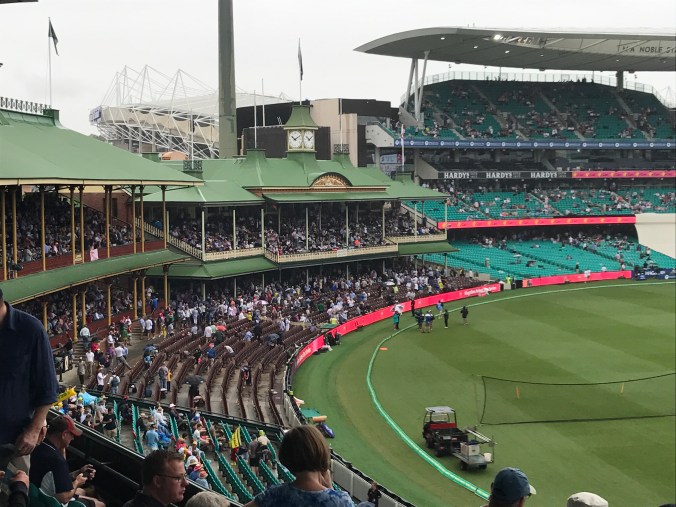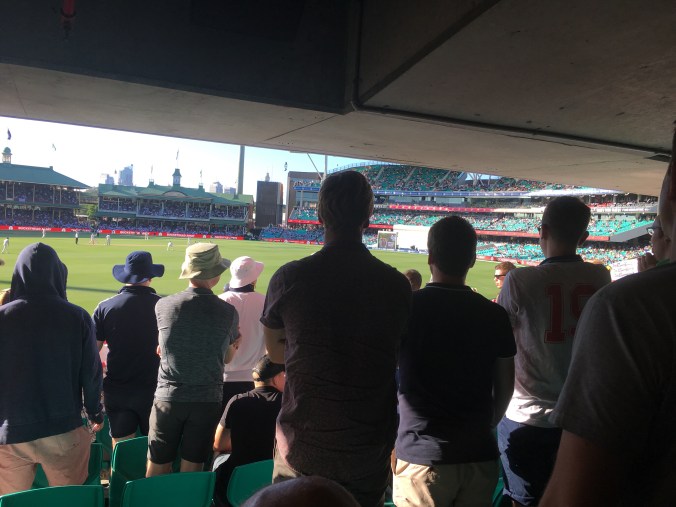 Steve returned about midnight having had a fun night of Barmy Army drinking, singing and dancing – Tom returned some time later, having partied on with Tim Brooker, a fellow drinks rep from back home. We were amazed when Tom got up so willingly in the morning – the five of us set out for our day at the Sydney Cricket Ground. (I have to say, Tom certainly looked better than Tim looked the morning after)!