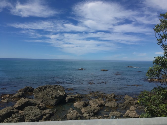 Further along this stretch of road we hit substantial roadworks – rerouting of roads due to cliff fall (recent earthquake damage) + repair to the cliff sides. We passed through a succession of stop/go signs (very small signs – we nearly went straight past the first one!) being held up mostly by attractive young girls or young men … and we received lots of smiles and waves – it was like they’d been on a customer service course. And as for cones, I have never ever seen so many – they must be big business in New Zealand. We couldn’t believe some of the workers and equipment working at the heights they were, made your stomach churn!!