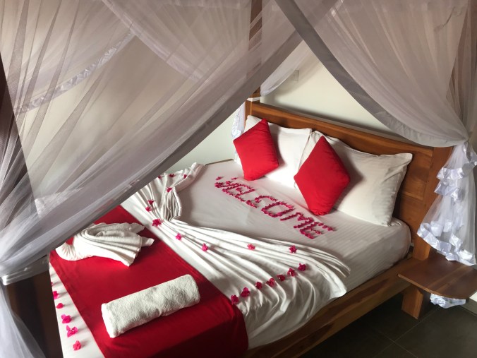 And what a welcome we had … all the staff came out to greet us with genuine excitement. We were presented with the most beautiful and scented of flower garlands and proudly escorted to our chalet which had been dressed up fit for a King and Queen.