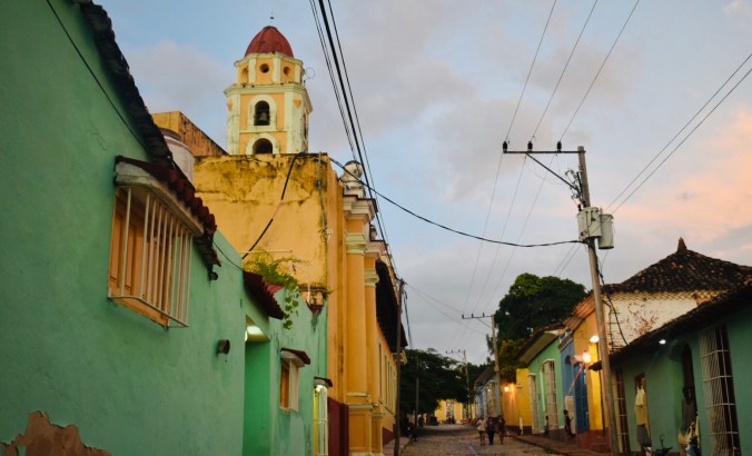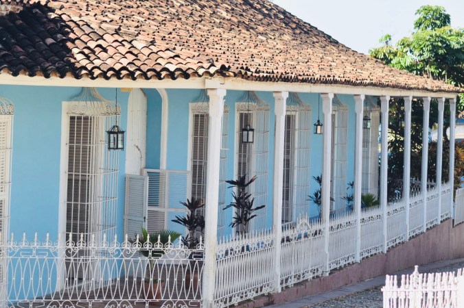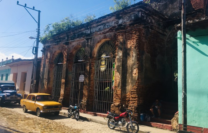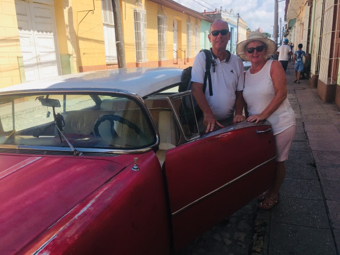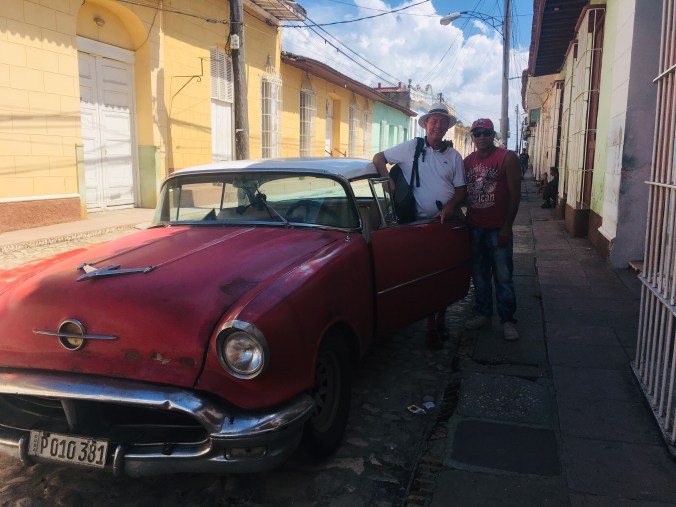 This morning we took a taxi into Trinidad. The hostal’s usual driver was away today so a jolly chap in an old American car showed up. Very luxurious inside with it’s white leather upholstery but how it all holds together is a mystery … no suspension and incredibly loose steering – the driver was having to turn the wheel all the time, even driving in a straight line. And of course the roads are covered in potholes so the cars drive to avoid … this means you drive on the wrong side and sort of dodge back when something comes the other way – it’s like playing ‘chicken.’
