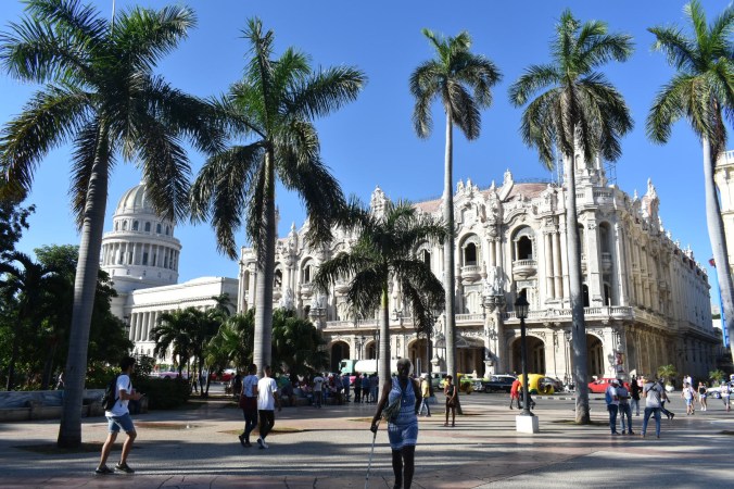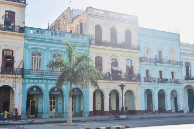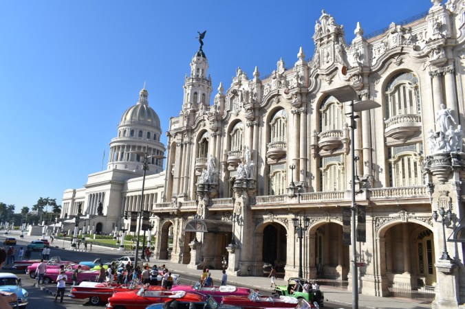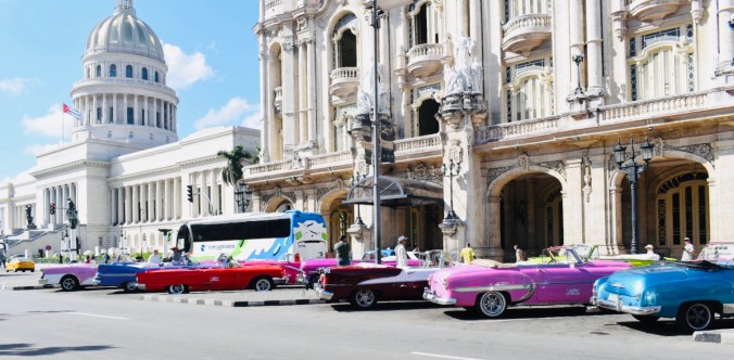 Surprisingly we were up early and excitedly went down to discover what was on the breakfast menu. Not great! A buffet of course, and fairly limited – we were disappointed but made the most of what we could find. And then we were straight out for more exploring of the city. Weβre so pleased that weβve based ourselves in Havana Centro as itβs in walking distance of so many of the great sights. Itβs an architectural dream here – you literally canβt help but take photos, we have hundreds of them. Definitely a city of contrasts however – the most magnificent buildings, that compete with the likes of Paris, Rome and London …. but so much of the city has been left to crumble. The pavements and plazas near these grand places are clean and neatly paved but as soon as you enter the side streets where the Cuban people live youβre walking in unhygienic conditions and pothole ridden streets. But we love having a good root around all the different areas – itβs fascinating. Again we were constantly approached by men selling city tours – you get the hang of it after a while.