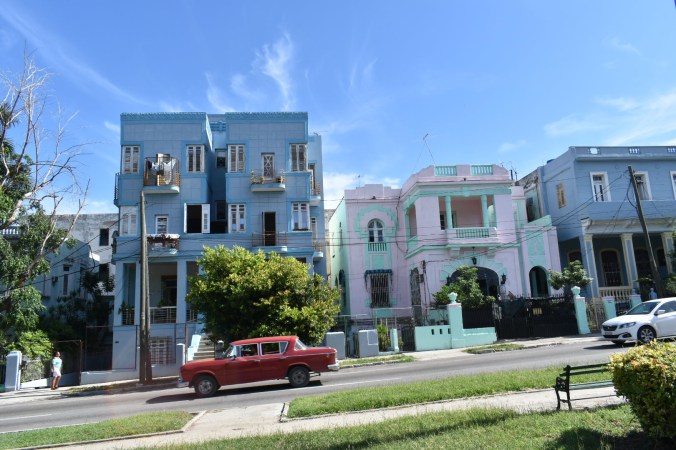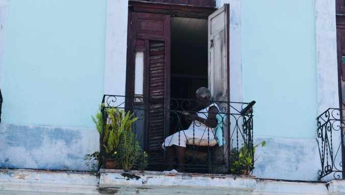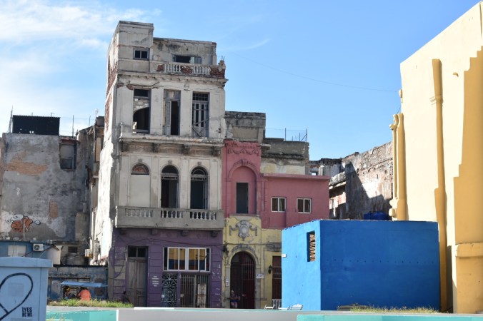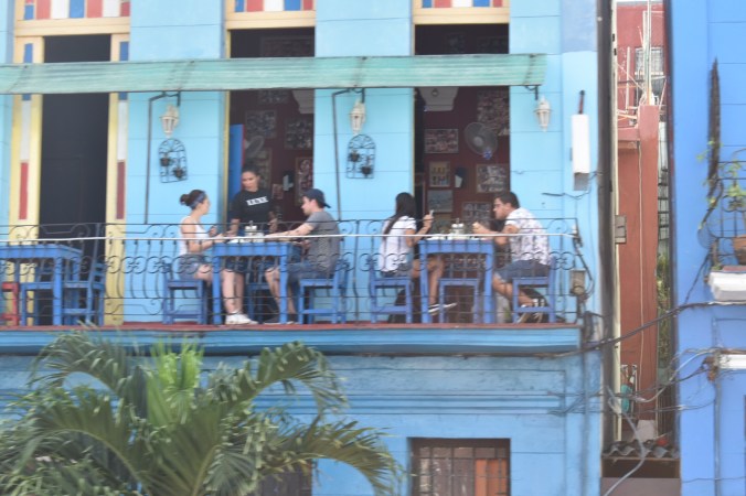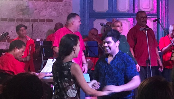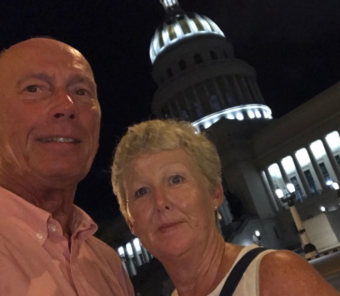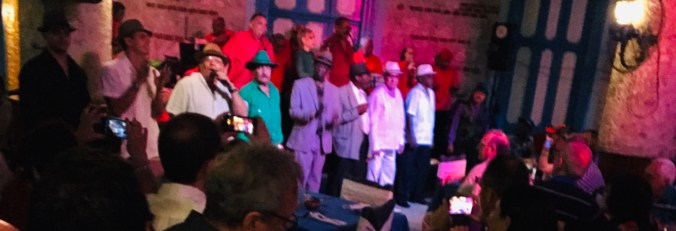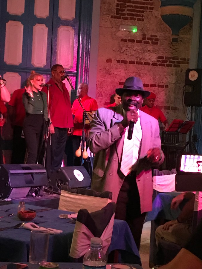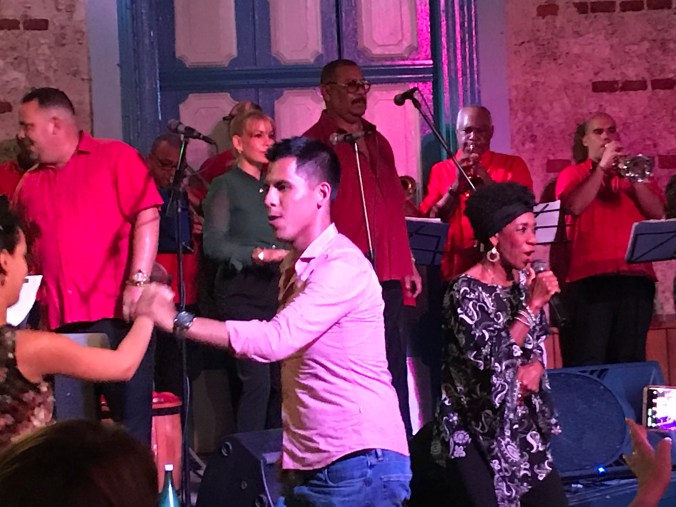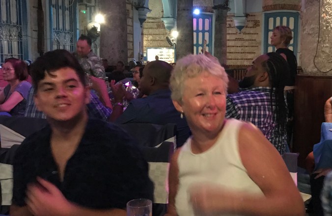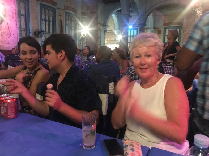 And in the evening we had a real blast … we went on an AirBnB experience. We met up with Rocci (a lovely young Cuban girl) and her two sidekicks Victor and Mario in a trendy bar in Centro Havana. Rocci explained that the bar had been set up on the ground floor of someoneβs home – it is only in recent years that private enterprises have been allowed and so some people are using their family homes to set up bars, restaurants, shops etc. We were joined by 12 other visitors of all ages and nationalities and we had a few drinks while getting to know each other. Naturally Steve and I were the oldest members! Then we all walked together to a music venue called the Buena Vista Social Club. It was a huge old building with a room tastefully set out with long tables and fancifully dressed chairs. I guess it was for tourists but it was a pleasant environment … and our group were having lots of fun. We had drinks and a meal (pork and rice, naturally) and then more drinks. The music was absolutely first class – Cuban music from the 40s and 50s and going – a whole line up of solo artists taking turns, the majority of them looked well into their 70s. The atmosphere was amazing – impossible to sit still. And then there were the dancers who were a real showpiece. But the best bit was that we were all up dancing, Steve too (and he loved it this time) We danced the night away … I had two βyoung menβ (Victor and Mario) asking me to dance all night – itβs been a long time since thatβs happened. And Steve and I were in the final 7 of our group that stayed to the very end – 11.30pm!! It had been a terrific night and we giggled our weary dancing legs home!