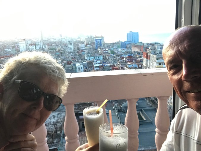 Rather than change we thought weβd keep going so up we went to the 9th floor of our hotel to try out the Roof Terrace bar and enjoy the fabulous views over the city – 2 pina coladas later we headed back to old Havana and enjoyed a delicious meal in an Italian restaurant. We had great chats with the owner, a young girl called Sofia …. and she insisted on us having free rum after weβd polished off a bottle of red wine! And so by 9.00pm weβd had rather a selection of alcohol beverages and were ready to get our heads down on those comfy pillows.