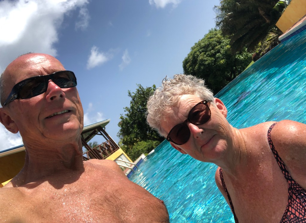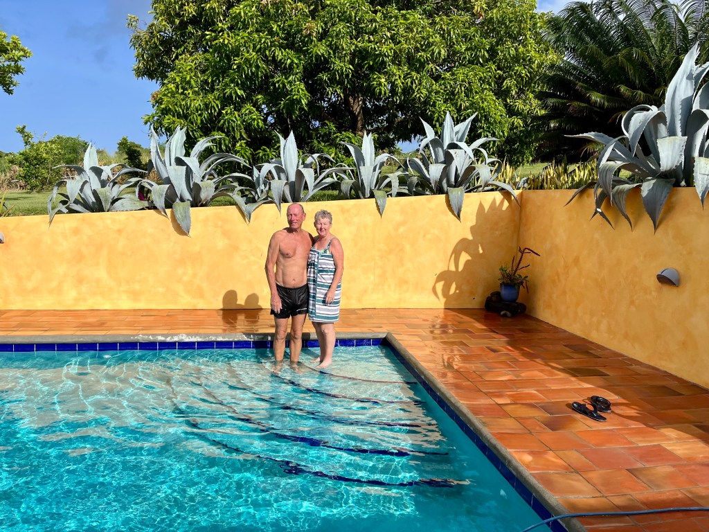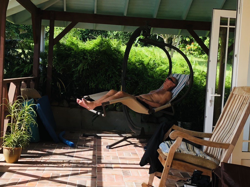 And the rest of the week has been more relaxation, swimming, reading, writing, some chores plus regular Youtube exercise sessions. We took a hot walk down to our local beach but unfortunately it’s not that inviting – the river meets the sea and so is churned up and murky – decided to return to our beautiful pool instead. While we were there though, we did see an elderly, very slight Rastafarian man, inch his way down the hill from his hut, on his bottom, fully naked … casually diving in for a swim. We’ve since learned that his name is Rambo … wouldn’t have been the first nickname to spring to mind.
