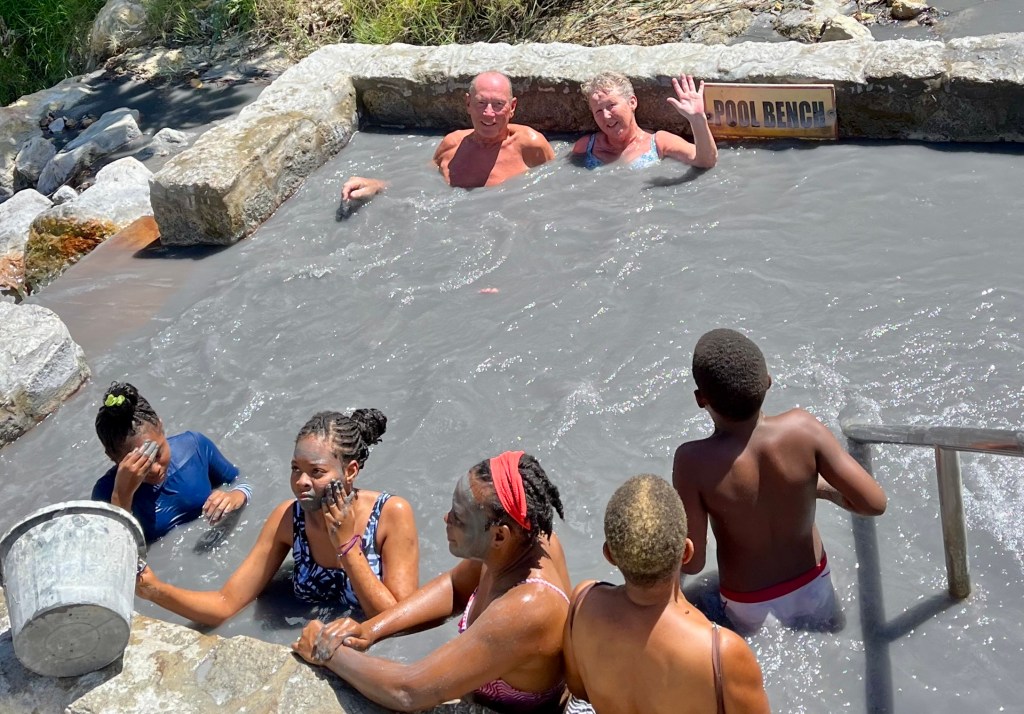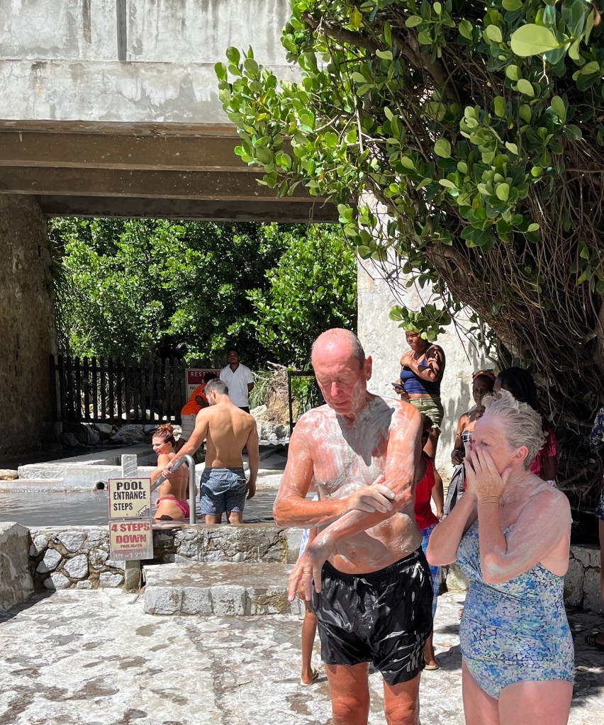 A couple of hundred metres downstream from the springs, the water temperature is still hot (about 45 degrees celsius) but cool enough for tourists to enjoy a mud bath. Well, whilst in Rome and all that …!! So, off with the clothes and into the excruciatingly HOT muddy water we went – questioning ourselves as to why. Then, we were encouraged to cake our faces and body with further mud supplied in buckets … said to heal sunburn, eczema, arthritis, sore joints and more. Despite not having any of these conditions we did as we were told and joined in with the throng of others experiencing this strangest of exercises. It was fun, and different, except the water was so hot that my heart was racing big time. Walking up the hill to the car in the heat afterwards I started to feel dizzy but luckily enough made it back in time to rehydrate and bask in the car’s air-conditioning.