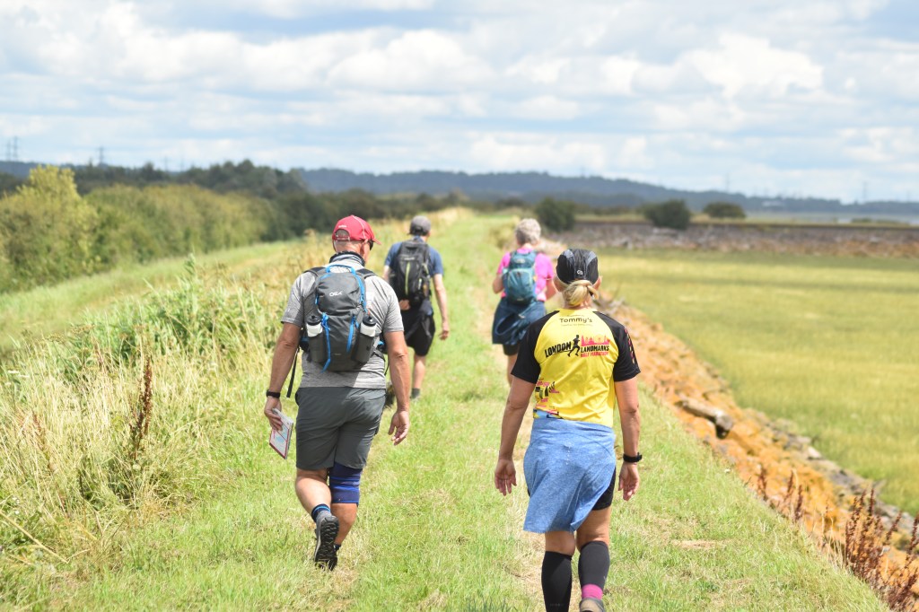 At last we were on our way – sadly not too scenic to start as we passed the Water Treatment Works shortly followed by a sprawling Travellers’ settlement. Now we all try so hard to be accepting of people’s choice of lifestyle but this proves more difficult when for the next half mile we had to walk through piles and piles of their discarded waste – not the most pleasant of starts. Things did improve though and after a short stretch of shingle walking followed by scrambling through some ferociously overgrown brambles, it was mostly that flat and easy sea wall walking the guide book had suggested. It seemed pretty endless at times, the embankment just stretching miles ahead, as far as the eye could see. We had intermittent showers too which meant waterproofs were on an off at regular intervals as the showers were quite heavy and then followed by roasting sunshine.