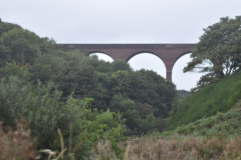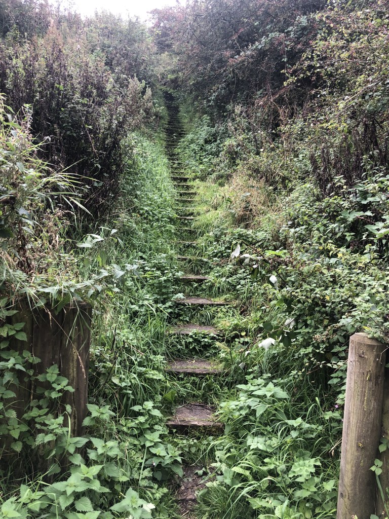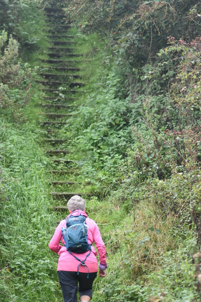 I have to say, there were some incredibly scenic parts to the next leg of the walk, albeit largely shrouded in mist and we were never far away from the sea, which we love. Also some touching memorials to the area’s mining history. However, this section of coastline was one of the worst paths we’d encountered … it was tough. In summary, it was massively overgrown, slippery underfoot, narrow paths that literally just about fitted in the width of your foot, so many steep inclines with difficult steps and of course the same going downhill each time … again and again and again. We continued to get lost and found ourselves retracing our steps, we had to wade though water and sinking mud. At one point we had to scramble up a hellishly steep, stone uphill path that was so overgrown we could see nothing beneath our knees – we just had to step and hope for the best with all sorts of tripping and slipping hazards. I lost my balance for a moment and grabbed out … onto a piece of gorse (not great). This particular scramble will forever be imprinted on my brain and the echoes of “this is ridiculous” and “I hate Coastal Walking” will surely be remembered!!? And … why oh why did I wear shorts?