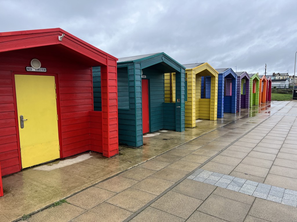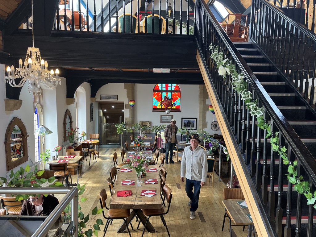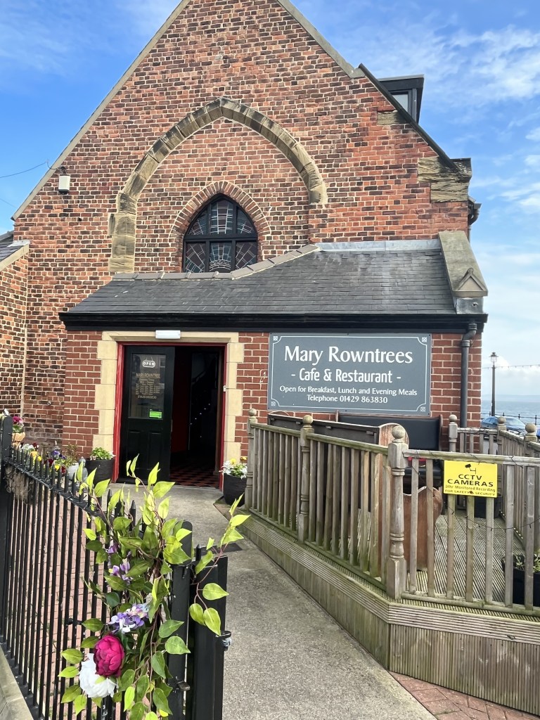 After 8 miles of walking we reached civilisation – a promenade. A remarkable thing we’ve noticed on this coastline is that there are so many houses with sea views here – and not the expensive sort of beachside homes you found in many counties, but regular terraced homes and new builds etc. So, walking past all this stunningly located housing we felt sure there’d be cafes in abundance … but it was another 2 miles before we reached the area of ‘Headland’ and came across ‘Mary Rowntrees’ cafe and restaurant where we luxuriated in our first coffee of the day. We were joined by the owner and her son who were absolutely lovely … they asked us to take photos of their restaurant for the blog.