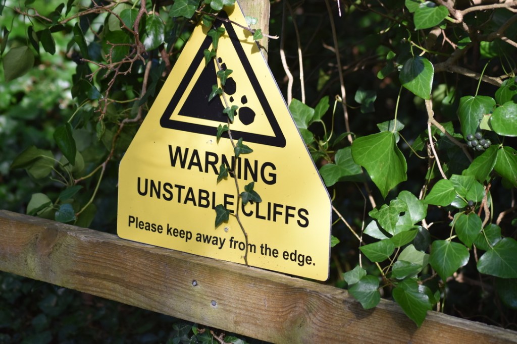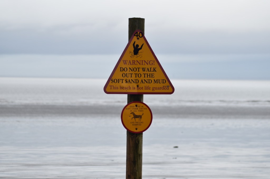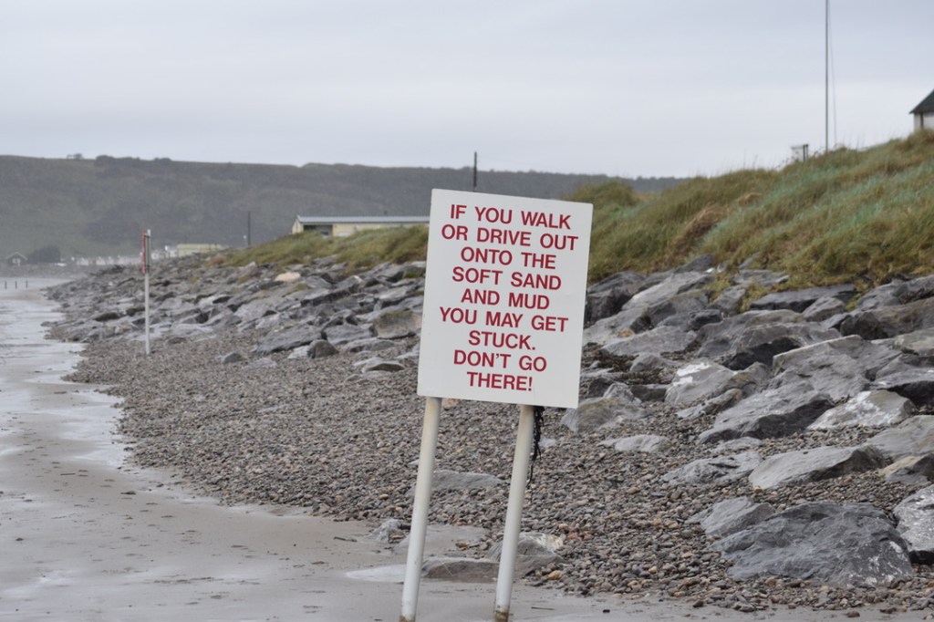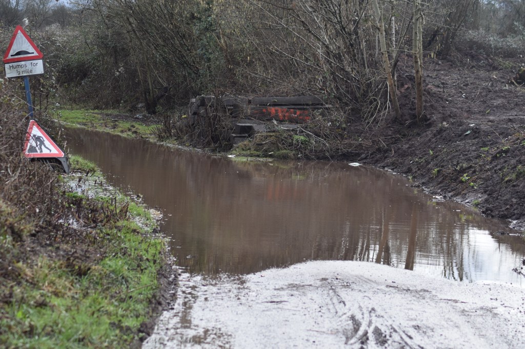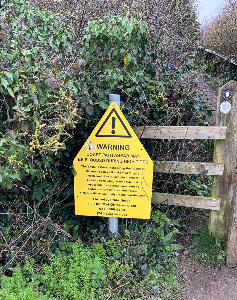 Steep climbs / descents (on mud and running streams), rock climbing, the opportunity to get stranded on the beach along with aforementioned path diversion which entailed wading through water about twelve inches deep … the picture is below, and if you’re thinking that’s a river then you are correct, although it’s supposed to be a road but in the meantime the heavy plant from the power station has had different ideas. The warning sign picture of high tide flooding was actually after I had walked along three miles of beach, it would have been a real help if that sign had been at both ends of the beach!