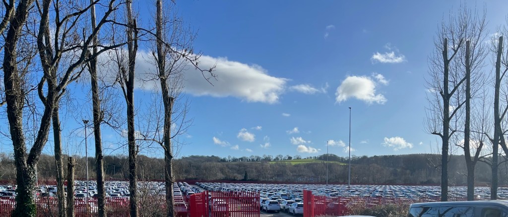 After Portishead, there was a bit more woodland walking, then some country lanes and bridle paths to lead us all the way back to Pill, where our trusty car awaited. The terrain improved although there were still some muddy patches and deep puddles lurking. We couldn’t help but be fascinated by the miles and miles of car storage facilities in this area – brand new shiny cars all lined up waiting to go somewhere – wish they could spare us one.